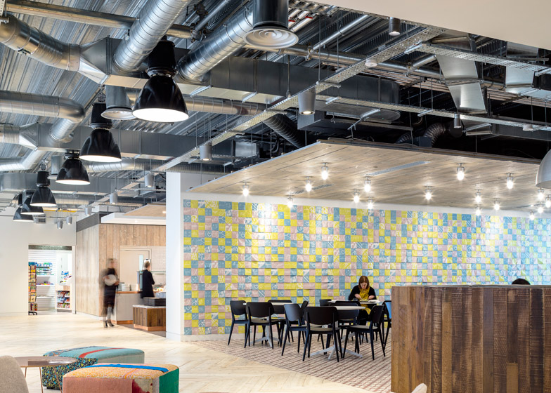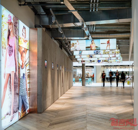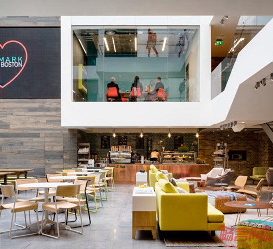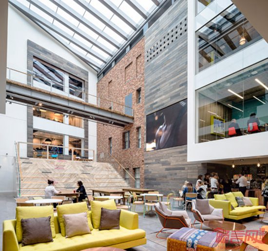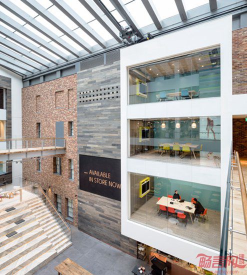 MoreySmith工作室完成了爱尔兰都柏林Primark总部办公楼室内装饰。业主是一家平价时装零售商,墙面装饰利用了回收的购物袋和衣物标签。总部建筑由一座20世纪保护建筑和1990年代现代建筑组成,一座13米长的木钢材料桥梁跨越了中庭。中庭原先是户外庭院,涵盖了咖啡厅、酒吧和非正式办公区。空间带有玻璃顶棚,将自然光带到四层办公区域内,为600位员工营造了良好的办公环境。