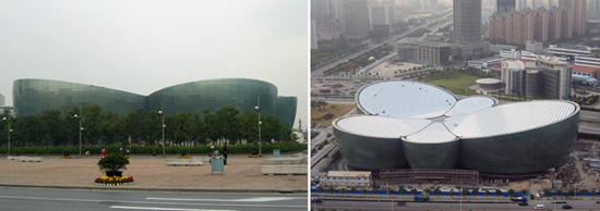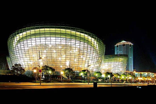 上海东方艺术中心坐落于浦东行政文化中心,由市政府和浦东新区政府投资10亿元建造的,总建筑面积近40,000平方米,由法国著名建筑师保罗·安德鲁设计。整个建筑外表采用金属夹层玻璃幕墙,内墙装饰特制的浅黄、赭红、棕色、灰色的陶瓷挂件。从高处俯瞰,五个半球体依次为:正厅入口、东方演奏厅、东方音乐厅、展览厅、东方歌剧厅。它们犹如五片绽放的花瓣,组成了一朵硕大美丽的"蝴蝶兰"。建筑顶部安装了融入高科技的880多盏嵌入式顶灯,当美妙的旋律在音乐厅奏响时,灯光会随旋律起伏变幻,将夜色中的东方艺术中心变的璀璨奇异、充满动感。