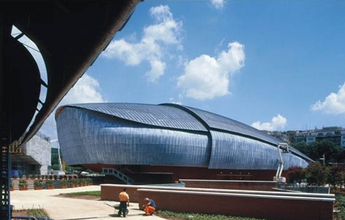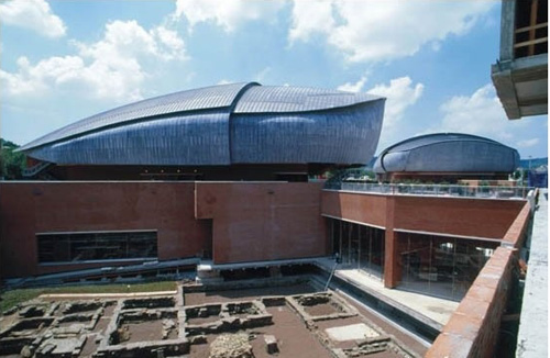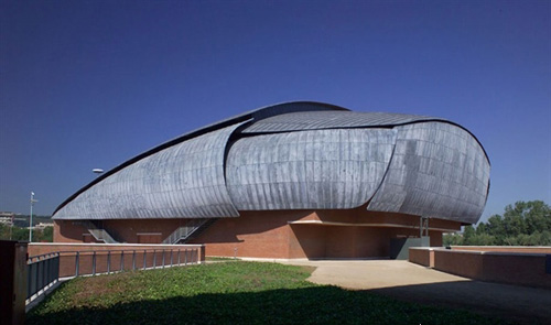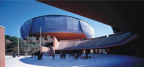 意大利建筑家伦佐·皮亚纳设计这一规模庞大的联合式音乐厅由三个独立的剧院组成,围绕一块开阔地而建。