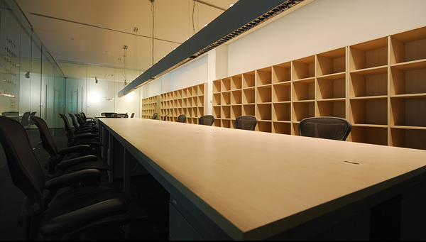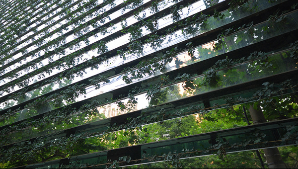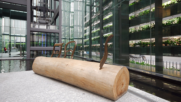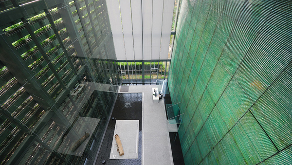 隈研吾没有放过任何一细节。花栏的浇灌方式也很特别。门厅像是一个被分离的室外空间,空间很静谧。一侧是沿街的镜子立面,一侧是用条形绿玻璃条做成的肌理效果,玻璃条截面是切角后的正方形。门厅的交通很简洁,一条小径通达办公区和电梯,周围是人工水面。
