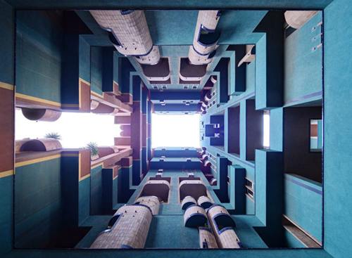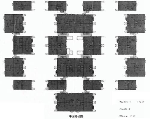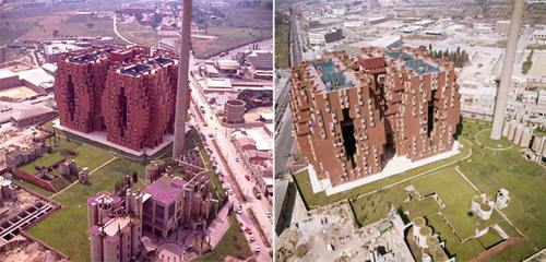 Walden7住宅位于巴塞罗那市郊,外观犹如一个坚实的城堡,高达60米,可容纳446户。茶红色的外观隐喻了西班牙人的热情、奔放的性格;半圆形或四分之一圆的各种阳台源于传统烟囱的意象,从而唤起人们的记忆——这里曾是一个旧工厂的遗址。建筑的开口部设计得很大,6层高的大门设计借助纪念性建筑的语言,创造出特有的崇高与威严的气氛。内庭四周的墙壁以蓝色的贴面砖覆盖,与外观的红色演绎而成的生动空间相对照,烘托出一个安然幽静的世界。