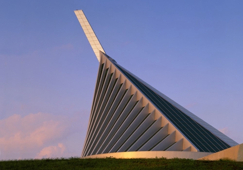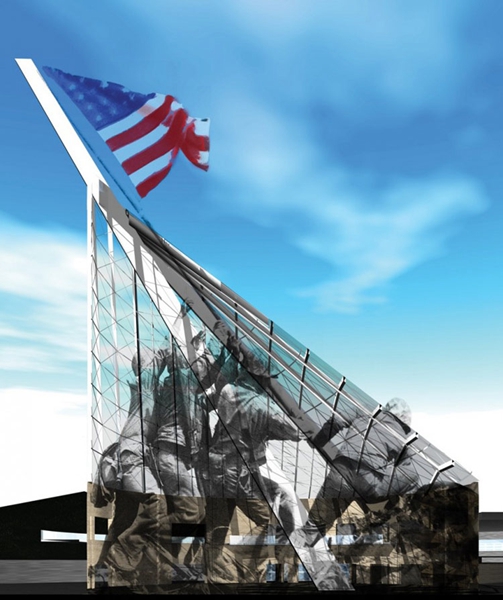 这个博物馆呈现出令人振奋的视觉效果,设计的灵感来源于一幅关于二战时期的照片,照片中展出的是一名英勇的士兵勇敢地将美国国旗插在了Suribachi山顶。这个形象被应用于设计,成为博物馆标志性的结构。从这个角度出发,设计师抽出了照片中的中心元素,形成一个210英尺高的钢铁杆,它主导和驾驭着整个入口大厅,支撑着一个肋骨形圆锥形的天窗。