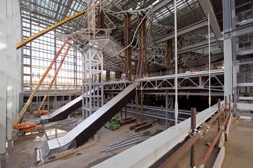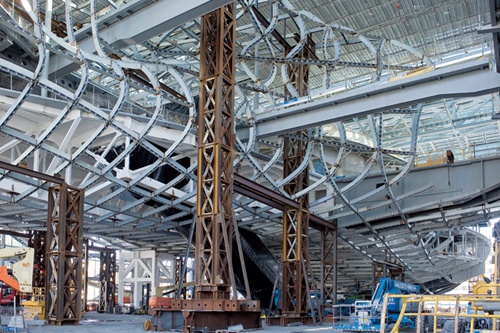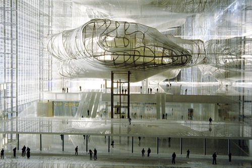 “云”是整个项目的核心。它被压缩进囊状物形成的盒子给人们展示了一个没有形状、没有规则的自由空间和一个极端的几何空间的不同。云状结构中包括一个1 850个座位的礼堂、休闲区以及为礼堂服务的各种设施。“云”毫无疑问是整个项目最为独特的建筑元素,这个极具视觉观感的构筑是钢架被15 000㎡透明帘幕覆盖。独立的建筑“刀锋”是一座拥有441间客房的酒店。综合体地下设有600车位的停车场。