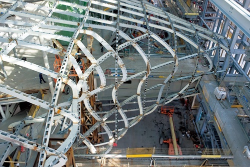 新会议中心因为其非凡的艺术价值,创新的物流模式和高新材料的选用而显得极为出众。综合体具有多种用途,可供举办各型会议展览,“云”可容纳1 850人,加上各种大型会议室共计6 500席,整个综合体容量上限为9 000人。会议中心采用一系列的环保措施,力求达到节能减排。设计包括一个气候控制系统,空调可根据室内实际人口密度确定最佳能源使用计划;在“囊”的表面添加太阳能光伏装置进行自然发电,并通过缓解阳光照射的手段防止建筑过热,与传统空调的固定制冷过程相比可大幅节能。
