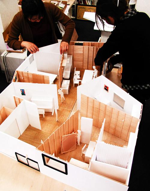 内部空间是一个以放射状配置的墙面缓缓区隔出来的连续性单一空间,而这些12mm的薄木合板墙与45mm的角柱,是整个房子的主要结构;墙的一面涂成白的,另一面则是裸露的柱面,并以木材原有的肌理外露。这些墙的配置角度看似随机,但其实是经过大量的计算研究后决定出来的,为的是不要让各个空间直接暴露于视线之中。透过不限定各个房间的机能所存在的暧昧性格,使得每一次在室内走动时映入眼里的房间之间的关系都有所改变。在其中,经由视点的改变,可以发现空间的各个角落看起来很近但其实很远、似乎开放却又狭窄、看似分离但却又相连在一起,个别的居住领域因而带有微妙的关系性。借由距离感的塑造而使得住宅内部空间产生无限的变化。