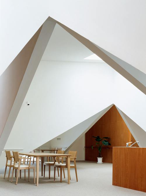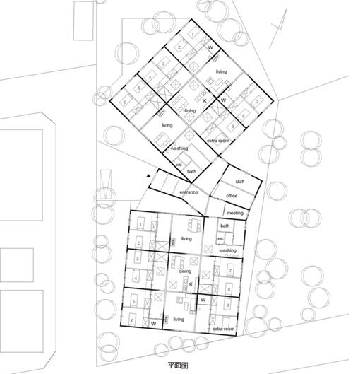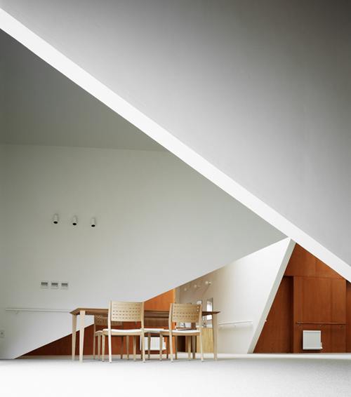 这栋银发族(含痴呆症患者)之家位于北海道登别市。沿着主要入口中心分为两个单元,每一个单元有9个房间,因此可以收容18个老人。空间主体由一个上下摆动的3x3穿越式大架构组成,整个环境在于创造出一种既连结又分离的空间感。有些部分可以作为起居室与用餐空间,而某些靠近终端的地方因着有墙的围塑而具较为安定的性格。整个空间的体验在墙体与非墙体的交替间持续变化,为老人提供了一个具有多变性、且生活刺激感的居住场所。