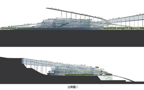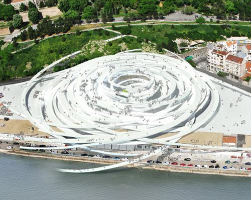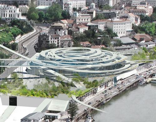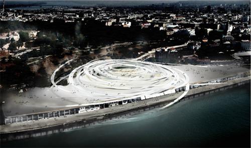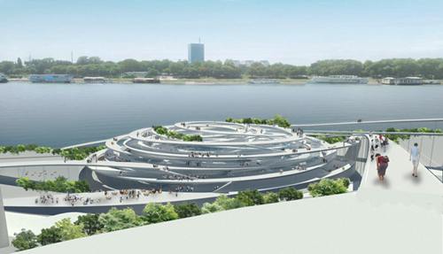 2012年日本建筑师藤本壮介完成了塞尔维亚贝尔格莱德“beton hala滨水中心”项目概念设计。基地位于kalemegden公园,萨瓦河畔,邻近要塞墙。这一方案占据了整个基地,并将所有的平面缠绕进一个巨大的螺旋结构体重,这个由丝带状坡道组成的建筑被藤本壮介称为“漂浮的云”。这座建筑物作为社会和运输功能综合系统,位于文化中心区,用自由流动的循环漩涡系统连接了多个区域。