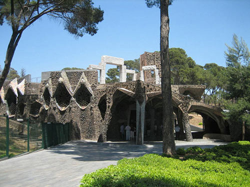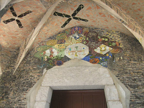 沿着礼拜堂右侧的楼梯往上,到达地窖礼拜堂的屋顶,这儿才是教堂的地面建筑要开始之处,但到现在为止,仍然是一片平地,地上画的原点和线条,表示梁柱所在地及支橕点。 这些如树枝般的支柱,配上小小的马赛克花纹,以及礼拜堂内粗犷的玫瑰花窗,在在散发着一种自然原生的氛围,完全不同于其他教堂的人造圣洁感。礼拜堂内以木头和铸铁做成的椅子,也是出自高第的设计。 除了奎尔村的小教堂外,村镇内的民宅,皆以红砖、石为主要建材,令人眼花撩乱的红砖排列与堆砌法,让人不得不佩服高第等人对于砖石、几何学的高超运用,许多砖石堆砌法甚至和中国的闵式建筑有异曲同工之妙!