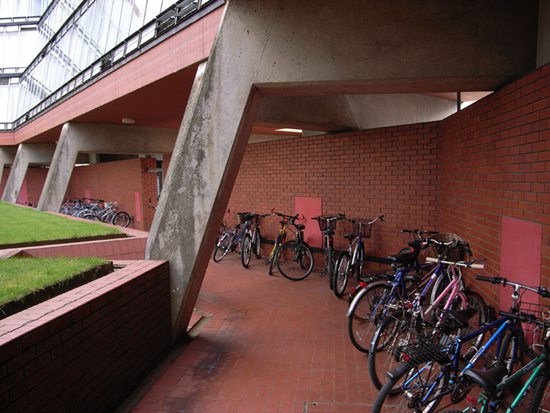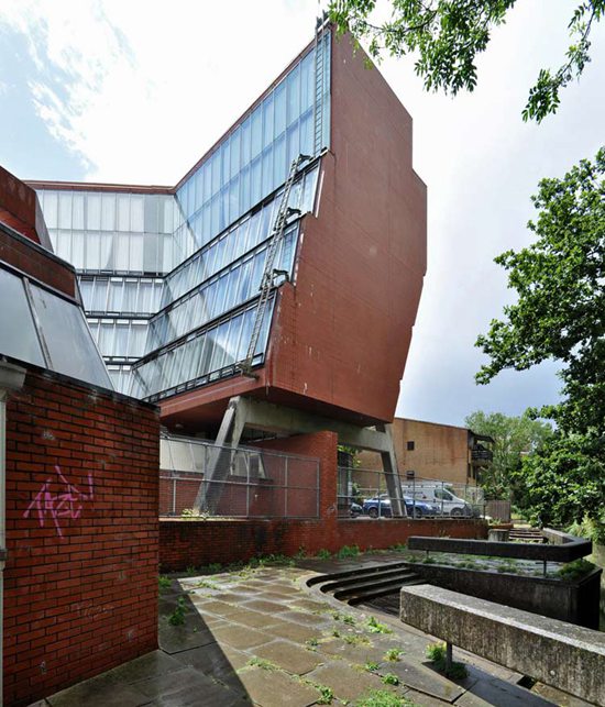 大楼的底层采用了混凝土结构,并且有裸露在外的人字形钢结构支撑。在斯特林之前的一些学院大楼设计中,主要采用了赤褐色瓷砖进行立面的铺筑,此次内部则使用U型结构组成了朝向北侧的玻璃立面结构并且透过玻璃可以看到韦尔河的景色。四层的大楼包括74个公寓单元,顶层则是一个两层楼高的美术馆,为研究生所使用,底层则是餐厅和一些基础设备的所在位置。