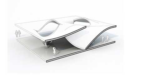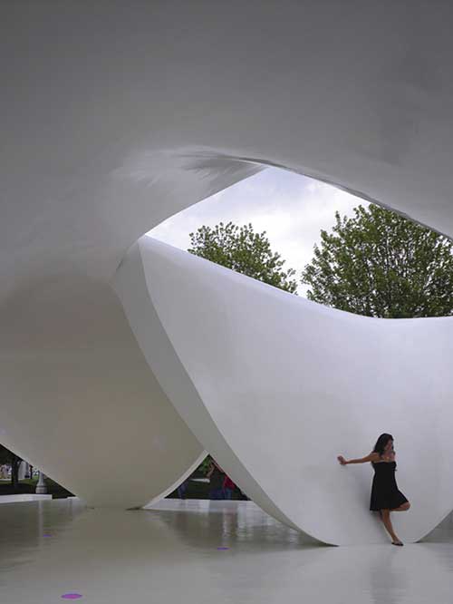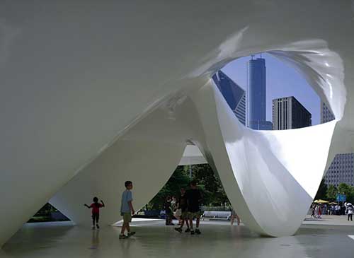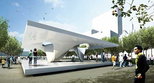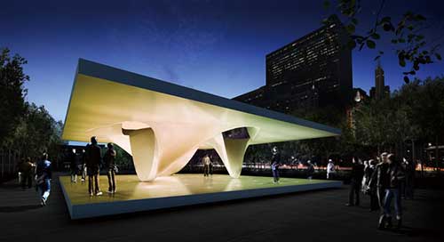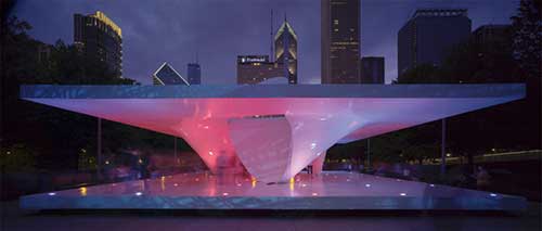 展亭坐落于密歇根湖千禧公园中央的一处独特的地方,一侧紧临密歇根大道。项目的本意是想吸引更多的人前来散步、游览和观光。基于对城市背景、项目类型及规模的考虑,UNStudio将展亭设计既体现了现有规则的几何构造,又营造出富于动感和多维的空间效果。它很好地适应了城市环境和千禧公园的客流,引入了面向公园和城市环境的诸多景观。