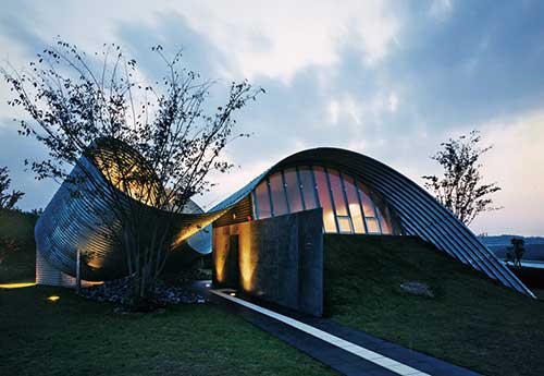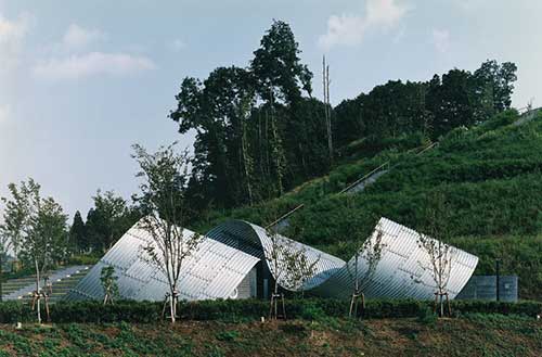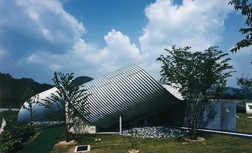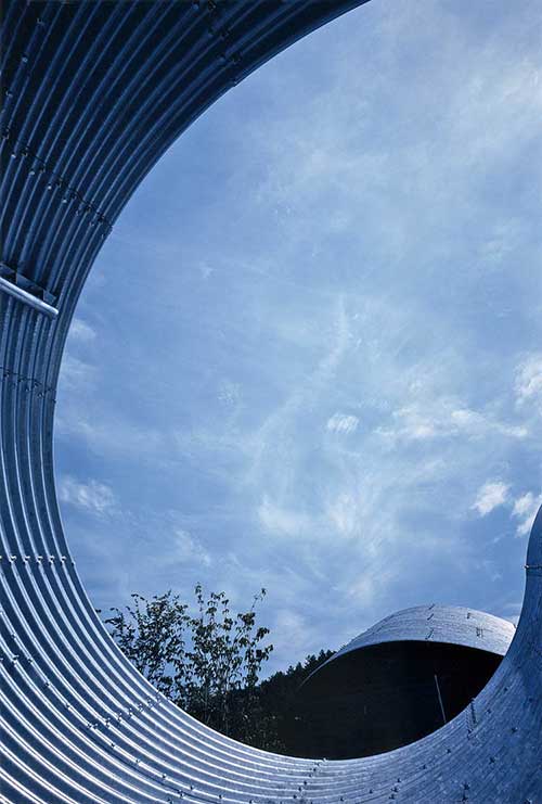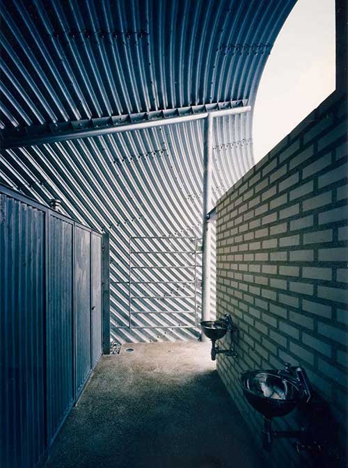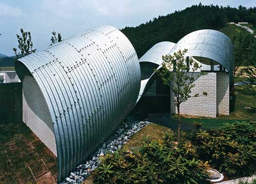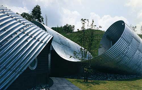 这座小建筑位于一个小公园内,从大阪乘坐新干线列车1小时就可到达公园所在的兵库县。这种小建筑在日本境内相当常见,通常无法反映任何地域特征。该管理处位于当地新建的小学和中学中间,结构简单,包括3个部分:一个看门人的房间及男女厕所。公厕可为人们提供方便,具有开放性、安全性和封闭性的特征。这个小小的管理处是3种简单功能的组合。开放的本质是易于通过,而这个管理处在3个方向上都有出入口,没有明确的界定。这种做法避免了用透明玻璃界定入口所带来的防御性。换句话说这使得整个设施成为一个通道,几乎从任何方向都可进入。另一方面,3.2mm厚的透气性波纹钢板屋顶、墙壁和地板创造出了空间的封闭性。这种材料还被应用在独立的螺旋钢板及部分嵌套构件中。该建筑的设计理念旨在运用波纹钢板创造兼具开放性和封闭性的空间。室内墙壁同时也是室外天花板和地板,外部的墙体和屋顶也向室内渗透。室内外形成富有变化的联系,这种全新的建筑形式完全不同于既有观念。该建筑同时也是室内外元素持续相互作用创造空间的全新尝试,将地板、墙壁和屋顶部分融合在一起。