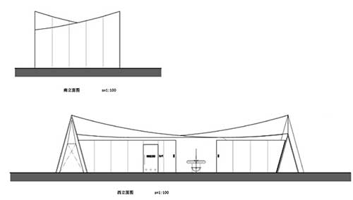 该项目所用材料是防腐蚀钢板。桁架结构是用25mm厚的钢板制作的,位于建筑左右两端。悬臂曲线由16mm厚的钢板制作,跨度达到20m,厕所的蹲位就位于这个大空间下方。建筑的左右山墙承载着屋面,相互倾斜。施工过程中,它们在重力的作用下发生了变形和扭曲,之后还经历了整修。