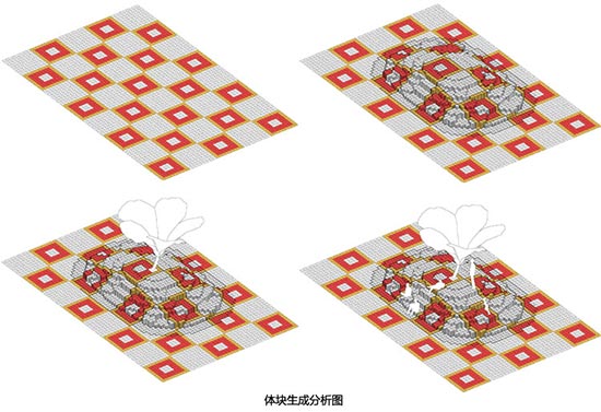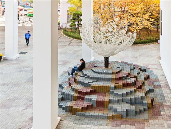 “花垫”从地面升腾而起,仿佛崔正化设计的鲜花雕塑绚烂绽放。小山型的设计遵循了现有人行道的棋盘式图案和颜色,由常见的环环相扣的水泥铺路砖制作而成。这些“花垫”呈向心状的椭圆形环绕鲜花雕塑,平面长度为10m,宽7m,高1.2m。