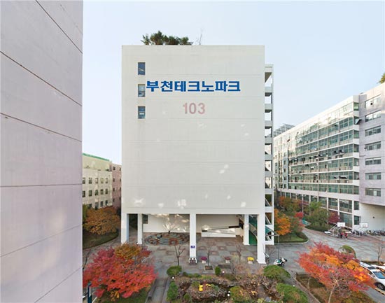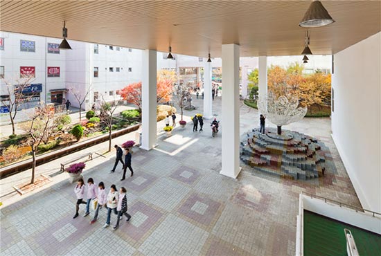 “花垫”位于富川市科技园1号街区的底层架空柱空间,艺术家崔正化用回收硬件制作而成的雕塑“伊人如花”也位于此。现有的底层架空柱空间有8m高的天花板,尽管该空间尺度宽阔,并占据了该高层工厂街区的显要位置,但这一部分并没有得到很好的利用。因此,建筑师设计了一个聚集空间,以便于工厂员工在此休息、聚会或开展各种户外表演活动。同时,还充当花朵雕塑的基座。
