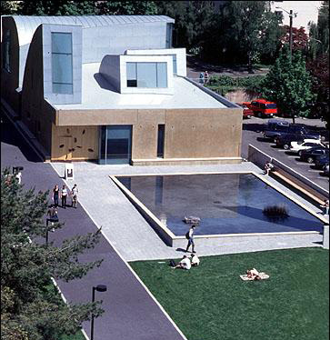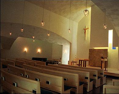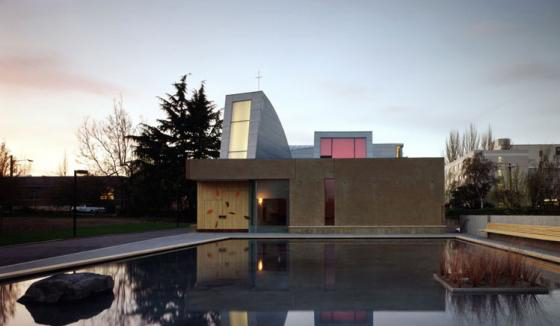圣·依纳爵教堂的外观,是一个极其朴素的混凝土建筑,看起来象盒子,盒子上面是渗着神秘色彩的镀锌顶罩。一个浅浅的可以看到倒影的池塘和高耸的钟塔把教堂与校园的其他部分隔开,教堂从一个类似停车场的平台上竖立起来,并用21块倾斜的混凝土墙板,使用象拼图玩具那样的方法装配成整个建筑,在建筑的接缝处有少量狭长窗户,混凝土墙板曾经被涂成罗马式的褐色,吊装混凝土时用的吊环被保留下来当作教堂的装饰。