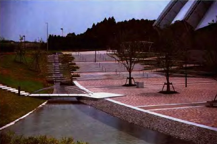 作为运动场馆,为了追求获得市民共鸣的设计效果,采用大手笔的主入口广场空间。并通过台阶、流水、小桥构成连续性的景观,创造出人间尺度的、亲切宜人的停留空间。