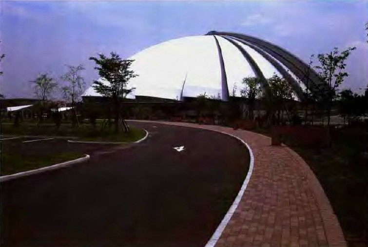 宫城县仙台市泉区野村字新桂岛前,面积为7.53万平方米。本作品特点,是室内体育场馆与周边环境的协调关系处理得很好。设计者首先利用地形,减少庞大构筑物的空间尺度。为营造利用面和被观察方的景观面,设置了散点式的休息小亭,成为完整统一的回游式场所空间。此外,为了协调建筑物与自然地形地貌的关系,设置了一些小型人工构筑物,使自然起伏的缓坡草坪有一段中间的过渡,从整体上达到既连续又十分协调、融洽的效果,真正构成了一幅美丽的自然画卷。