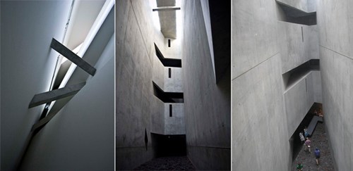 柏林犹太人博物馆平面就像是把“六角星”立体化后又破开的样子,将犹太人在柏林所受的痛苦、曲折,表现于以六角的大卫之星切割、解构后再重组的结果。博物馆有三个部分,一个是老的巴洛克时代的楼,一个是折线的建筑,还有一个是希望之塔。三个建筑的联系是在地下,以此来寓意历史的联系不是明确的,而是潜藏的。在地下有三条路通向三个空间,其中有一条路通向“大屠杀塔”,塔内冬冷夏热,什么都没有唯独有光,让人感受到希望抑或是绝望。另外一条路通向“逃亡者之园”,斜坡地面及不垂直的空间让人们在里面会产生失去秩序的感受。另外一条路就是笔直的通向一个未来空间。其实,很多人认为建筑是用来解决问题的,而丹尼尔却认为建筑是用来提出问题的。哲学、科学在提出问题,艺术也一样,建筑可以把问题提出得更加尖锐。柏林犹太人博物馆重新定义了城市的空间,重新让这个城市去思考“劫难”,它存在的意义便是让这个城市更加警醒。