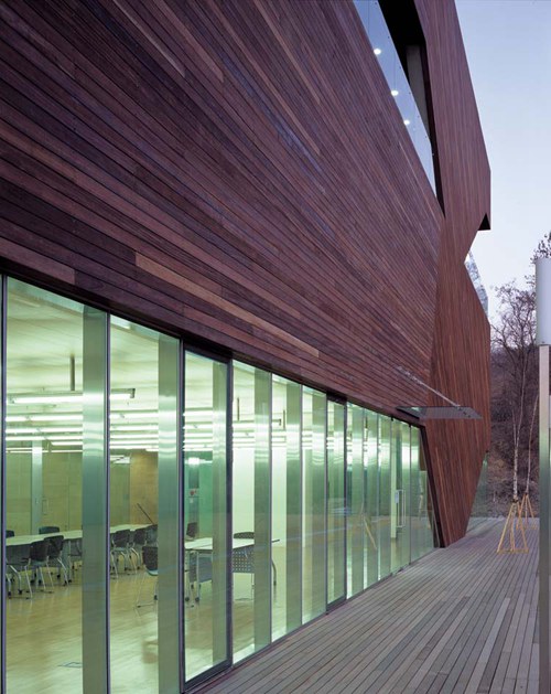 在充分挖掘坡州图书城所在郊区的特点后,设计将办公场所转变为建筑周围花园的延伸。为实现总体规划中对建筑走向的严格要求,将建筑设计成一个折叠式屏风,两侧分别是朝南的植物花园和朝北的矿物花园,两个花园自然延伸至建筑的南北侧,两立面分别使用木材和石材覆面。折叠式屏风结构的每个楼层交替朝向两个花园,所以在建筑穿梭的过程中会伴随景观和饰面材料的交替变化。