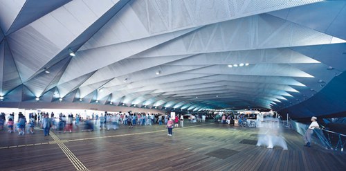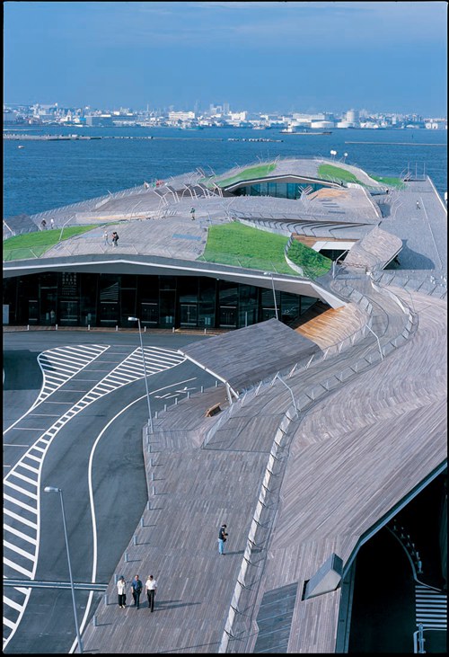 横滨国际码头是一种新型的城市便利交通设施。设计方案提出将建筑设计成码头景观的继续和延伸,而不是一个脱离码头基址肌理的物体,在满足码头所有功能的同时还在其屋顶建造一个大型的城市公园。