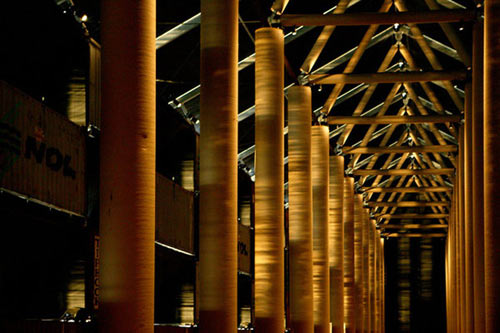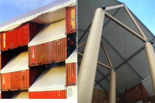 这是一座充满独特创意的展览建筑。面积为5200平方米其主体结构采用了152个钢质集装箱,屋项由再生纸所制的管子铺设而成,墙面使用了可循环使用的木板,地面则铺设石子和沙子。所有这些构件都可以方便地拆卸并运到外地重装,以作流动展出,而且这些材料也都可以回收再利用,体现了很好的环保理念。