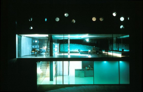 这座建筑充分运用了升降机的特点。升降机的地板被用作是可以变化的楼板。随着升降机的上下,升降机的楼板在地下层----架空的一层----相对封闭的二层之间游动,形成了魔幻神奇的效果。虽然乍一看室内仍然是现代建筑简洁的装饰手法,但底层的混凝土弧形通道、一层透空和二层封闭之间的对比、二层小而多的圆形窗洞、墙上的超现实主义绘画和古典风格的座椅----种种手法,都加强了这种魔幻效果。