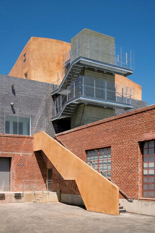 原始的单层砖砌库房始建于20世纪50年代早期,恰好位于现已废弃的南太平洋铁路东侧,直接服务大厦。20世纪90年代晚期,在大厦的西侧边缘新增一个二层石盒体建筑,取代了部分原始的砖结构,用作办公空间。建筑物在原始基础上增加了双层楼高,设置了供区域内的电影制作公司使用的新摄影棚和录音室。近期完工的三层位于录音棚顶端,为洛杉矶的娱乐和体育有线电台提供额外的办公室。
