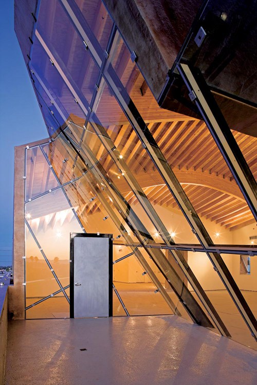 两个1.40m(42英寸)长的少竖框结构玻璃天窗将新加的第三楼层分割为三个室内工作区,天窗横跨三个独立办公模块之间1.83m(6英尺)跨度的釉面区域。在录音棚顶的左端,位于中间模块内的户外庭院被切割为外立面和屋顶,被倾斜的玻璃围合。钢管加固了店面的铝系统,以支撑倾斜的釉面的锐利折角。