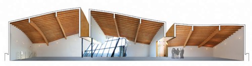 屋顶几何体由长12.80m(42英尺)的胶合叠层木梁建造而成,位于3.66m (12英尺)的中心,横跨南北;而0.05m(2英寸)×0.20m(8英寸)的木椽放置于0.41m(16英寸)的中心,横跨横梁。每个胶合叠层木梁都被打磨成独一无二的弧度,在顶层表面形成不断变化的、有斜面的边缘,以适应屋顶由于梁的跨度而形成的不同的倾斜度。数控磨椽被垂直安装在胶合木梁的东面或西面,经旋转与曲线形的屋顶表面垂直。每个木椽与屋顶相接的一边都被切割成曲线状,两端都有凹口用以悬挂横梁;每个木椽都被刻上指数代码用以确定位置,以便在整个屋顶结构中准确定位。