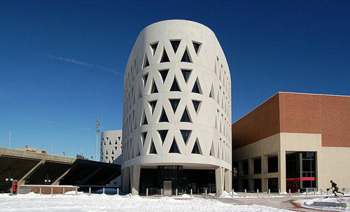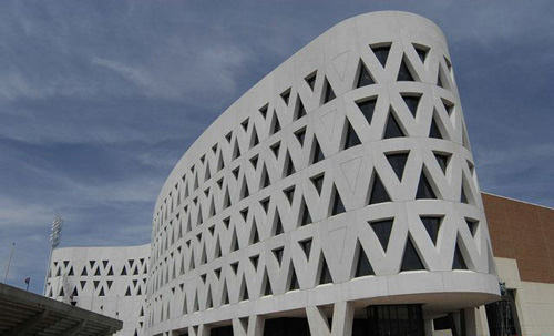 这一设计独特,造价1.05亿美元的理查德.E.林德纳体育中心位于美国俄亥俄州,隶属辛辛那提大学。该竞技体育训练中心专为高校学生运动员服务,内部设有先进诊断和治疗设施的医疗机构、各类俱乐部、行政办公室以及生活服务型商店等,尽可能满足了运动员的各类需求。体育中心的外观犹如独特的回旋镖形状,由预制混凝土构件建造而成。该体育中心以90度的优雅姿态连接着学校足球场,这种创意设计展现了美国人精准、力量、活力等竞技精神。