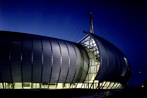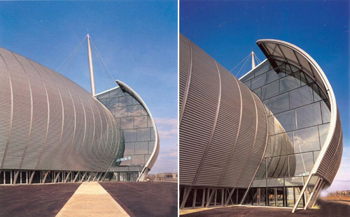 巴黎西北方向往鲁昂去的公路边有一个闪闪发光的曲线形宠然大物———这就是著名的鲁昂音乐厅和展览馆建筑群。它像一个巨大的飞碟刚降落在这块70英亩大的场地上。音乐厅的外墙是波纹铁皮牞屋面是轻质桁架以钢缆悬挂在三个桅柱上,外墙为铝合金框玻璃墙,屋面是拱形桁架。整个建筑群的建造才用了13个月的时间牞建筑的用材十分简单牞主要是现浇和预制清水混凝土牞工厂轧制的波纹铁皮和玻璃。建筑群给人的印象是简洁而不简单。