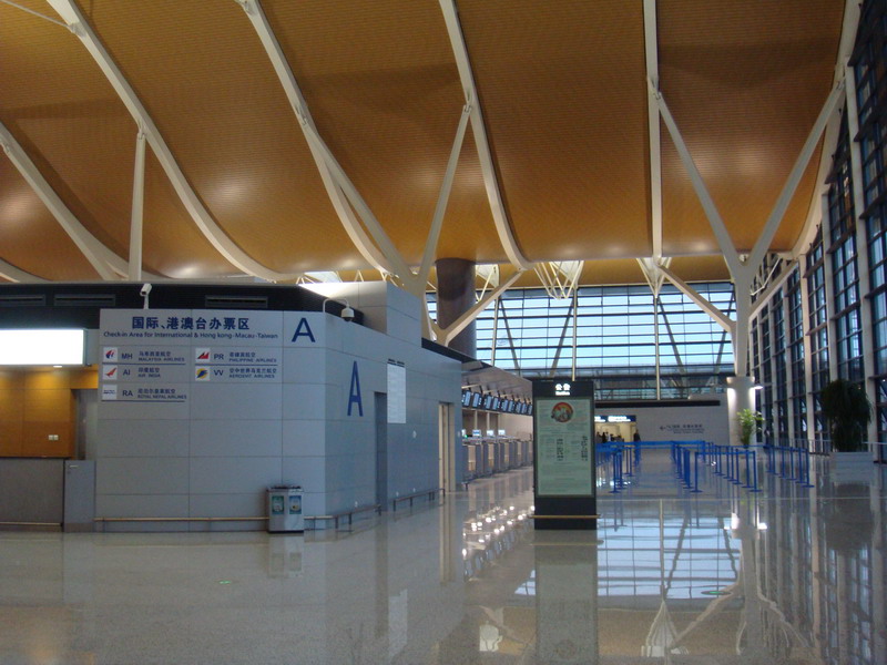 于1997年10月全面开工,1999年9月建成通航。以2005年为目标年,满足年旅客吞吐量2000万人次以及点对点的航班使用要求进行设计和建设。由主楼和候机长廊两大部分组成,均为三层结构,由两条信道连接,面积达27.8万平米,到港行李输送带13条,登机桥28座;候机楼内的商业餐饮设施和其它出租服务设施面积达6万平米。