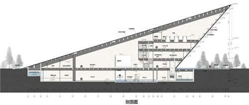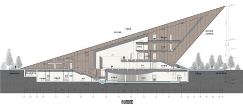 渡江战役纪念馆位于中国安徽合肥的巢湖北岸,整个纪念园占地约2.9万平米,建筑面积约1.5万平米,其中纪念馆为园区的核心部分。渡江战役纪念馆是为纪念中国解放战争中跨江统一全中国的重要战役,该纪念馆以“渡江”、“胜利”为主题,故本创意以简约、象形的表现主义手法表达主题思想,巨大的前倾三角形实体展现出一种势不可挡的力度与动感,从而营造“渡江”与“胜利”的氛围与场所感。在两块巨大三角实体中间空留出一条6米宽的“时空”隧道,将当今与历史贯通于一起,人们通过“渡”与“登”的行为动作体验与感受战争、胜利的隐喻。作为国内战争,两块巨大的纪念体犹如巨碑默默地向后人示意与陈述,以一种崇高的人文精神,包容态度客观地追忆以往,回顾过去,启迪后人追求和平与进步。