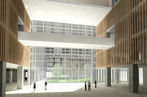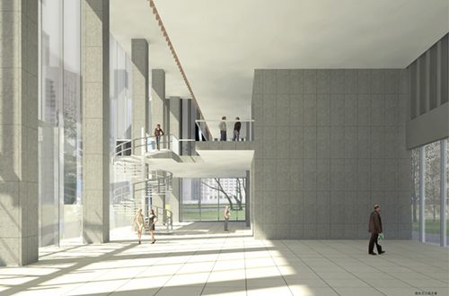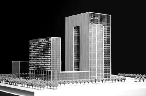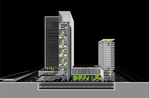 方案在整体布局上将建筑主体分为高端办公、配套服务公寓、产品展示空间三部分,北侧办公部分由两座塔楼组成,是形成建筑地标性“双塔”的主体部分;南侧配套服务公寓体量较小,有利于建筑整体的日照通风和景观视野;东侧裙房布置产品展示空间和创新产业用房。三者相对独立,底层空间连通呈U字形布局。中央公共庭院为建筑创造出良好的室外环境,同时也为远期发展提供预留土地。这种设计布局一方面沿道路周边形成高效的空间配置,释放出紧张的地面空间,另一方面办公和配套服务公寓各自朝南,高低错落、互不干扰,共同享有大南山景观资源。