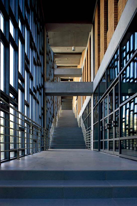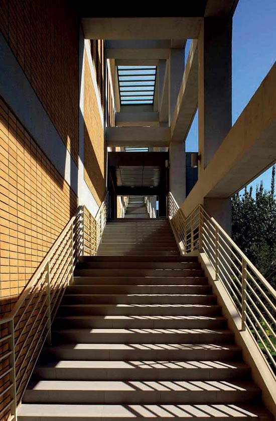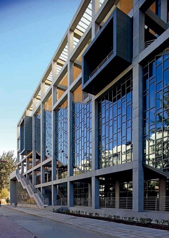 南北两侧2.7m宽的混凝土柱廊弱化了建筑边界,降低了建筑的压迫感。设于其中的室外楼梯除满足疏散要求外,也增加了建筑内外的交流,成为立体的校园路。结合东侧绿化广场设计的挑台,扩充了体育馆与周边环境的互动。西立面则通过设置遮阳板降低太阳西晒的影响。建筑的立面色彩和语言延续了临近的逸夫教学楼的形态,形成了积极的对话关系。