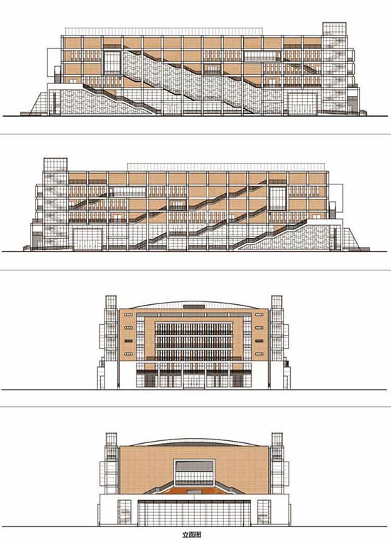 综合体育馆、游泳馆入口布置在一层。中途训练馆布置在综合体育馆的西侧,与综合体育馆使用上可分可合,方便教学、比赛使用;健身房和艺术沙龙布置在游泳馆上空南北两侧。体育教研室放在可俯瞰体育场西侧,便于管理。