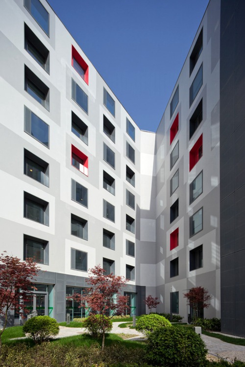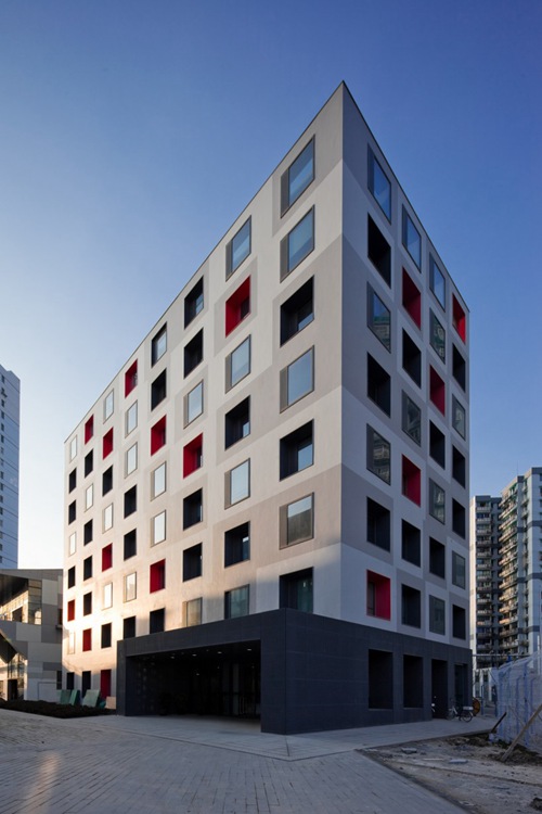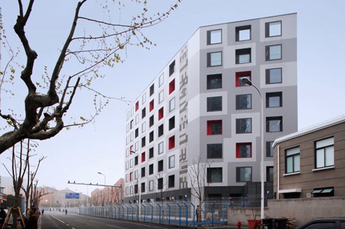 建筑体型基本沿袭旧有建筑的体型关系,为一个平面“U”型的多层板式建筑。立面处理遵循简洁、经济但不失美观的原则,各个方向立面均采用在墙面上均质开窗的形式,通过外墙涂料颜色的变化、拼接以及由于功能需求,不同材质的体量穿插,寻求该建筑独具一格的鲜明特色。
