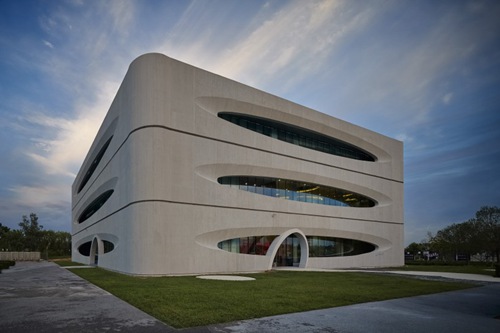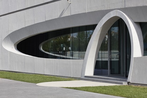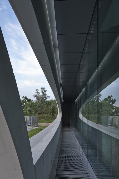 售楼处的外立面被均匀划分为三层,每层由一圈装饰混凝土轻型外墙板包裹内层的挑廊。每层外墙板中间均开一个横向椭圆形洞口,洞口部位是一个向内凹陷的不规则曲面,它为每层的挑廊以及建筑室内提供自然采光。