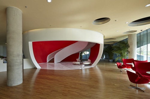 建筑地上三层,地下一层。地上首层、二层为销售用房,三层为开发商办公用房。地上三层空间通过一个桶状的中庭上下贯通,中庭顶部有天窗采光,形成建筑空间上的核心。首层和二层通过中庭内一个精心设计的钢制旋转楼梯进行沟通,方便了购房者的参观。同时,地上三层每层都在建筑四周设计了开敞外廊,购房者和开发商可以站在外廊观看工地情况。