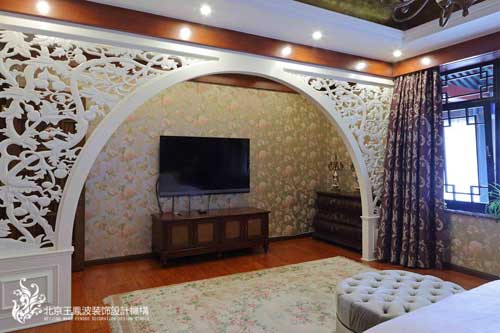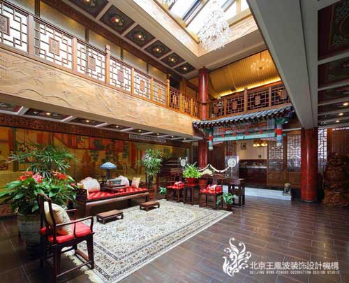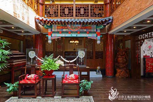 设计师在室内设计上,运用大红漆柱、金箔、彩绘,雕梁画栋,挂屏瓷器等装饰,充分表现出了中式设计的气势恢宏,壮丽华贵。高空间,大进深的中式设计精髓!在不慌不忙的端庄稳健中,彰显出大家风范。
