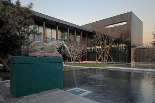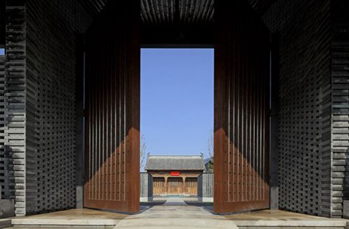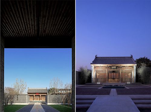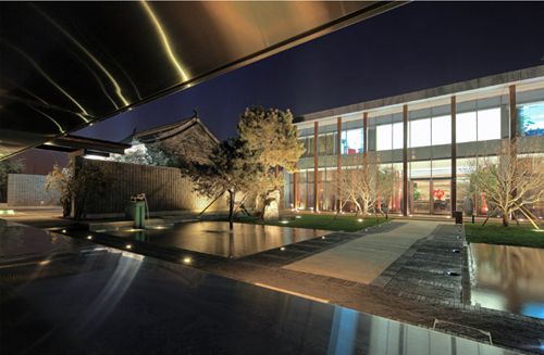 作为项目最重要的真品,这座来自山西的清代老宅正堂建筑具有祠堂的性质(祠堂是中国族人祭祀自己祖先或先贤的场所)。我们将这个老建筑放置在南大门和北样板房之间一起用以建立一个带有礼制性的中轴秩序空间,并将这个带有中国传统家庭精神纽带意义的建筑作为这个秩序空间的高潮点。其南设计了一个超尺度的大门用于框景,强化和暗示这个典型的中国空间秩序,但建筑语言则是当代的。在老建筑前设一处方形的缓冲空间,这个空间的中心设一处圆明园中如园的复原铸铜模型增加了空间的复合意义。向西可进入住区,向东则经过紫藤花架门便摆脱礼制空间的束缚,开启售楼处流动空间体验的句法环节,最终经过柱廊空间进入尾声即老房子以北的样板房区域。这里新设的景观,如长窗透镜墙,镜面水池,席纹铺地,松石如绘式场景,书法流水墙,连同清式的拴马桩,抱鼓石,石狮子和宋式石毕喜,以及大门、老房子、售楼处和样板房,对于它们相互空间关系的梳理和考究起到了关键的引导、组织和升华品质空间的作用,使得居住着获得了连续丰富的当代东方理想空间的的情感体验。