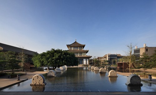 空间布局:整体布局采用中式王府大院,总平面呈严谨的中轴线对称式布局,以中式园林为主导,强调建筑的中轴线以及群落感,突出传统意境在空间院落上的存在。