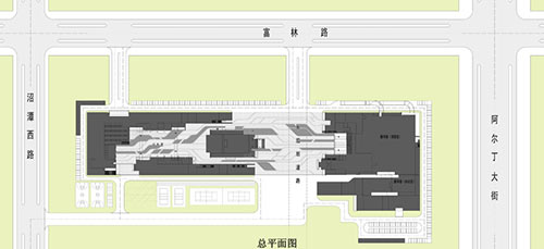 设计的灵感来自于内蒙古大草原的起伏延绵的特殊地貌特征,场地自东向西形成了四百余米巨大的跃动曲线,整个建筑群就像从地面生长出来一样。图书馆和少年宫曲线型的退台设计,最大程度的促进了使用者、公共广场和建筑之间的互动。由室外延伸至室外的中庭最大程度地导入阳光,开放式的楼梯和连廊以及延伸进两栋建筑内部的流线型绿化区域和铺装部分,增强了空间上的视觉连贯性,为人们提供了一个充满戏剧感的模糊空间。