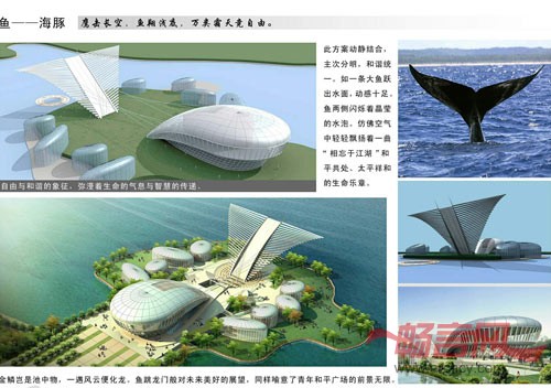 此方案动静结合,主次分明,和谐统一。如一条大鱼跃出水面,动感十足。鱼两次闪烁着菁英的水泡。仿佛空气中轻轻飘扬着一曲“相忘于江湖”和平共处、太平祥和的生命乐章。