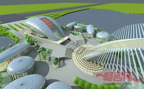 鱼的尾部为钢结构,高高扬起。界定了室外观众的空间,同时有遮阳的功能。并且与头部形成整体,丰富了空间与景观层次。