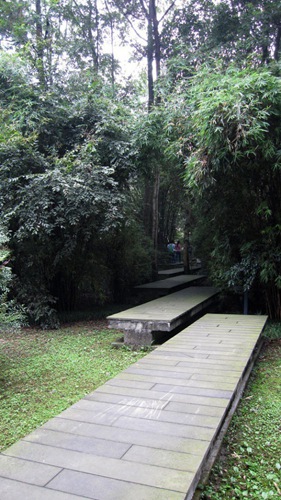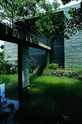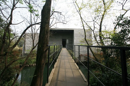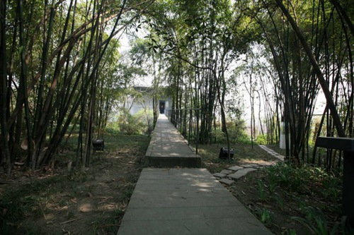 博物馆主体设置于基地中最大的一块林间平地上,其余两块空地,一个作为前区和停车场,一个作为后勤附属用房基地。竹林成为其间的自然分隔。路径串连起各区域,沿途逐渐架起,临空穿越慈竹林并引向莲池上的入口。博物馆采用展厅环绕中庭的布局,使参观者在迂回的行进路线中仍然保持中心性的定位。中庭二层高,采光利用各个建筑独立个体之间的间隙,而且朝向中庭的墙面都是按外墙处理的。利用建筑体块之间的间隙可以间断地看见河流,与风景之间是一种经过限制和组织的关系。每个展区都有不同的采光方式,如缝隙光、天光或壁面反射光,它们之间的共同点是非日常化。