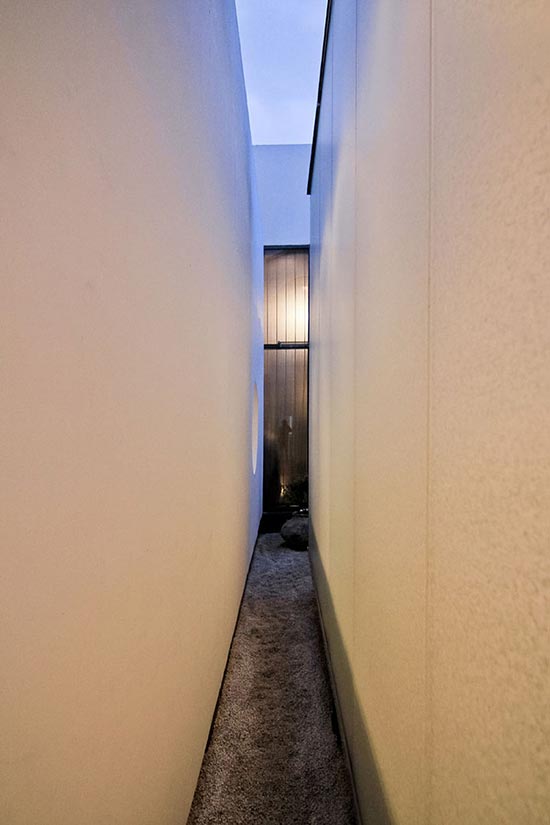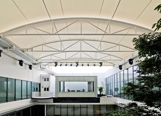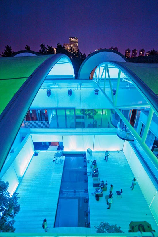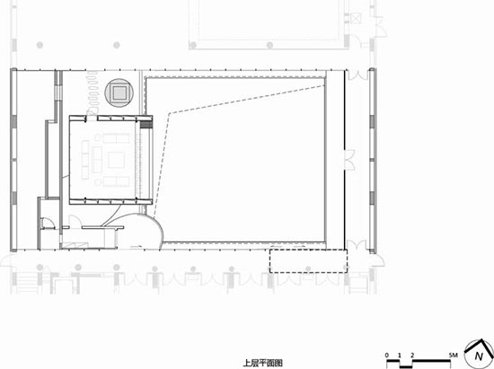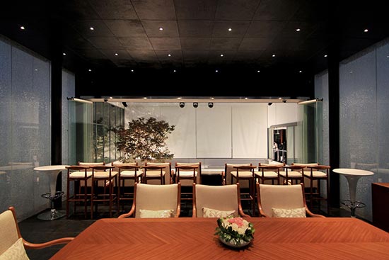 首先是采用白色的帷幕确定了剧院的边界,帷幕升起时是矶崎新的,落下后则是俞挺的。白色的帷幕切断了与现实世界的联系,与玻璃幕墙相隔400毫米,以设置音响与投影设备。院子里原有的水池,成为了舞台与观众席之间天然的界限,被自然的保留下来,同样的还有院子里栽下的树,成为整个虚空间里唯有的实。观众席与舞台采用同样的白色架空地板处理,配合整个环境白色的虚。二层原来是个空无一物的平台,建筑师在这里轻轻的放了一个玻璃盒子,居高临下,与普通的观众席隔开,作为一个VIP的包厢。经过在无极书院上的尝试成功,建筑师再次将宣纸玻璃运用在了这个包厢上,结合冰裂纹玻璃形成了这个包厢独有的双层表皮,两层玻璃之间的间隙也是在400毫米左右,自然而然提供了一种特有的观感。最后,根据剧本的需要,结合演出方与业主提供的建议,在剧场的上方加上了可以人工推拉开阖的顶棚、疏散所需的楼梯,自然也都是白色的。