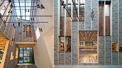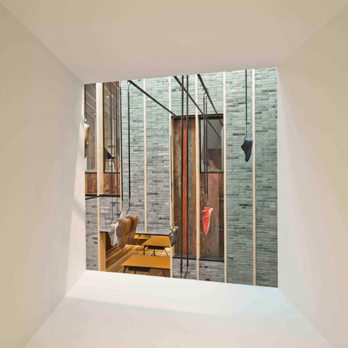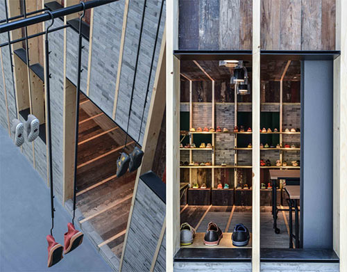 设计师以回收木与砖块装点了这个两层楼的内部建筑,简洁的材料经过设计师的构思呈现出丰富的空间变化与层次感,形成独特的鞋履展示空间。回收的木头与砖块来自于拆除的旧时弄堂建筑,砖块的表面依稀可见饱经岁月的留痕,陈旧的木板还留有当年旧报纸与墙纸黏贴的痕迹,这些印记勾起人们思绪联翩。