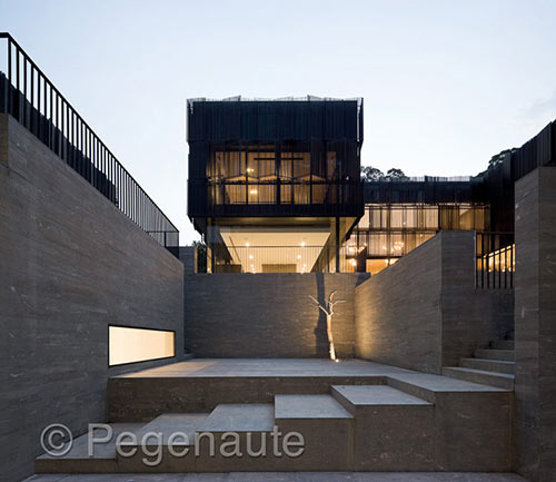 外立面上多层次材料的重叠运用是增强概念连续性的关键,从被玻璃围合的铺满平坦VALS石英岩的公共区域到上层包围着木百叶的私密空间。染黑柚木的百叶窗遮住了位于二层的十三间卧室,然而每间卧室的主人都可以根据天气或心情自行调节百叶窗的开启角度从而调节他们与外界的联系。在卧室另一面的走廊上是白色橡木制成的穿孔屏风,可以折叠也可以收起,让整个建筑有完全通透的可能性。双层挑空的空间呈现出不同材料所产生的层次感,同时也促进了个人与公共空间的相互交流。室内与室外,庭院和房子,私人空间与公共空间的界限被模糊了,如恩设计的这栋2,888㎡的房子通过一系列复杂的空间体验解读了住所、家庭和家庭生活之间的综合形态。