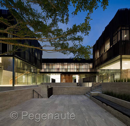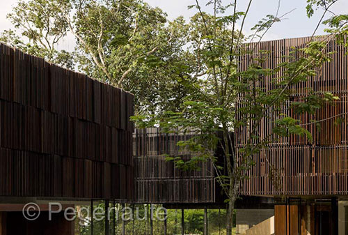 如恩并没有简单采用四合院的传统形态,而将其从固有“回”字型演化为两个优雅的L形体块,将内部的庭院延伸至外围的自然环境中去。室外与室内的连贯性,典型的热带居住特征,都在这里得以体现。将私密居住空间从地面提升至二层,底层地表面从室内延伸至室外形成了建筑的基座。一楼整层的透明玻璃外墙在使整个景观穿透入室内的同时居住的空间也开始向花园和泳池延伸,从感受上“占据”了室外。沿着环绕整栋建筑的蜿蜒的小径可以一览整个地块,同时水景将整座建筑与周围的景观也密不可分地融合在一起。其效果是,伸展开的每一寸土地都被带入进来,整个区域都是“家”。